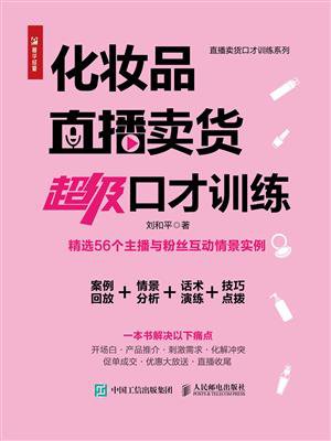 直播卖货作为一种新兴的销售方式,受到了越来越多的品牌商和制造商的青睐。化妆品是广大主播接触最多的品类之一,销售化妆品的主播必须具备出色的沟通能力和应变能力,才能做好自己的工作。《化妆品直播卖货超级口才训练》以常见的几十个场景为线索,介绍了主播在直播间销售化妆品的过程中可能遇到的问题,对粉丝的相关行为和心理进行了深入分析,阐述了主播需要掌握的沟通技巧,并给出了非常实用的话术范例。书中内容可以帮助化妆品主播增强沟通能力,顺利促成交易,持续提升业绩。《化妆品直播卖货超级口才训练》适合销售化妆品的主播阅读,也可以作为化妆品专卖店等零售终端的销售人员和销售管理的参考读物。