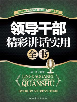 本书集各行符业,各种身份、职务的领导在各种场合的致辞经验于一体,囊括了竞选竟聘、走马上任、开/闭幕式、校园励志、公益善行、慰问讲话、吊唁逝者、答谢、纪念、岗位变动等多种场景。提供了不同的场景设置、多种演讲者的身份、丰富多彩的演讲主题及临场应用素材,从各行各业、各种场合的优秀演讲中精选出了日常实用的经典演讲范例,是人们在日常生活中和工作中经常使用的演讲题材。在任何情况下,《领导干部精彩讲话实用全书》都能为您提供理想的致辞方案,让您语出惊人,给听者留下深刻印象。《领导干部精彩讲话实用全书》不仅具有很强的实用性,而且具有很强的趣味性,让您人于目而融于心,朗于口而会于神。